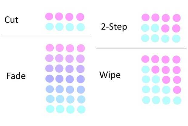 Al cambiar de una escena a otra se utilizan diversos efectos de transición. El software simula esto con cuatro efectos, un 'corte', un 'dos pasos' de la transición (con una imagen intermedia formada por componentes de las escenas antiguos y nuevos), un 'trapo' a la nueva escena en movimiento en de un lado a otro y un fundido de uno a otro. El uso de estos es también no uniformemente distribuido. Se utilizan cortes en su mayoría llanos.
