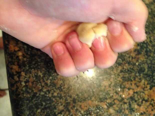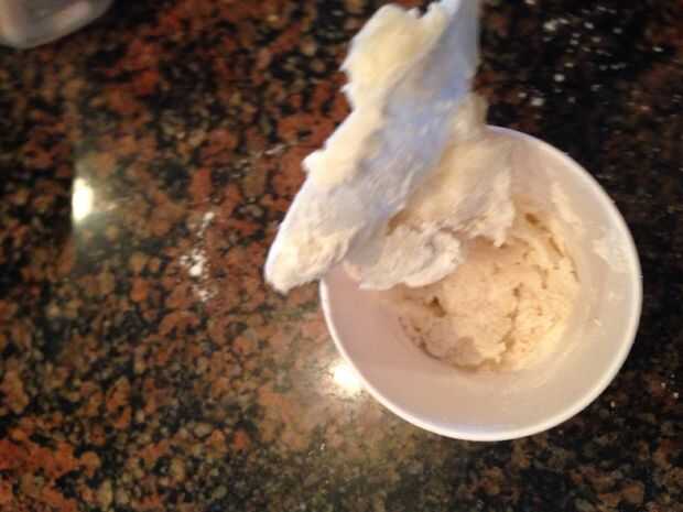 5. una vez que se ve como una masa sólida, esto debe tomar un tiempo. y en la mano y rodar alrededor hasta que se las y no escamoso.