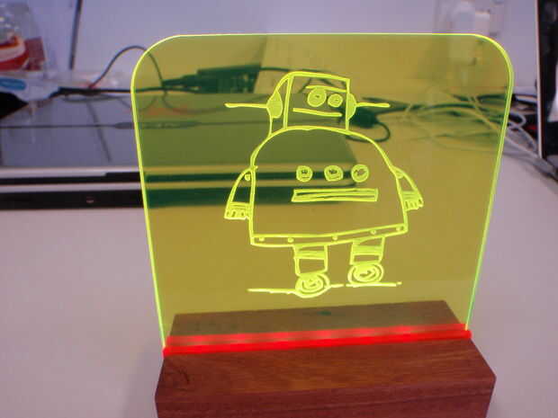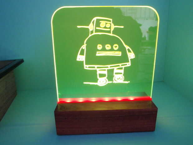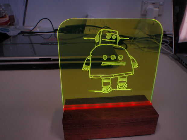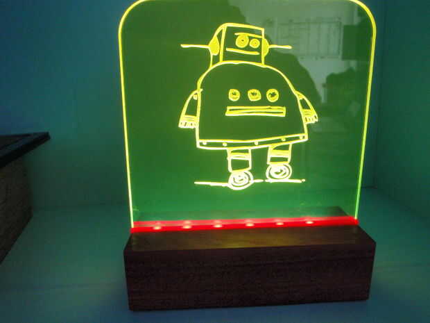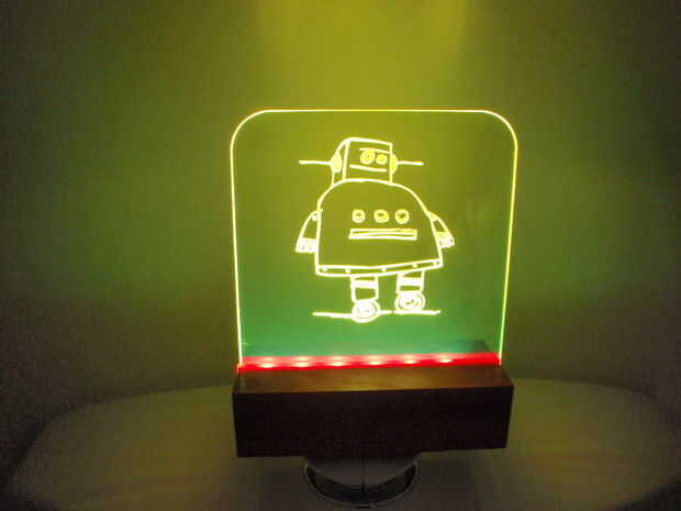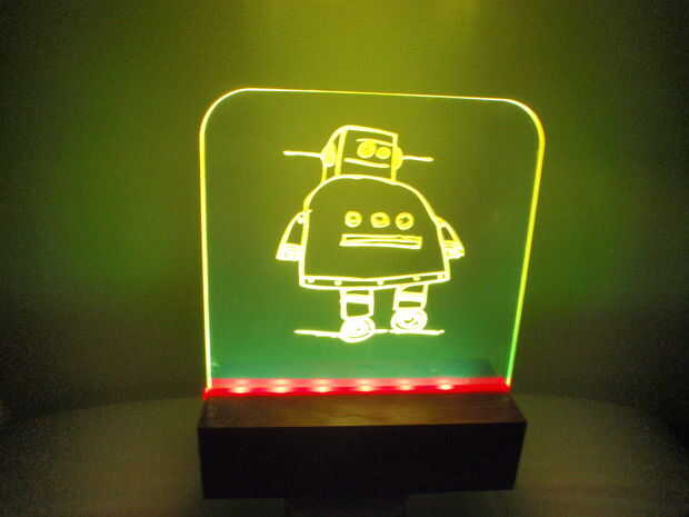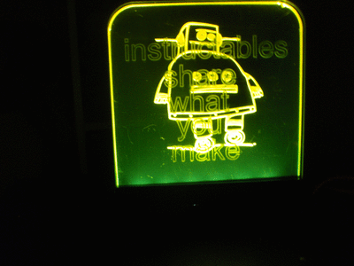 no sabía qué poner este instructable, "luz de la noche del robot" "resplandor en la muestra oscura" "nuevo lit grabado laser'"del hombre pobre muestra de neón"todos vinieron a la mente, pero esto podría ser utilizado para la señal de salida de emergencia, publicidad, un premio o podría simplemente para sentarse en su escritorio y mirar bastante. El tamaño es sólo limitado al tamaño del cortador láser tienes. Este se ejecuta de una batería, pero se puede ejecutar desde un paquete de enchufe, hasta a 12volts si va a funcionar todo el tiempo. Como con la mayoría de las cosas que producen luz resulta muy difícil tomar una foto que le hace a justicia, incluso en la luz del día parece realmente buena y en una sala de oscurecer que se enciende para arriba una parte de la habitación. Pasé más tiempo tomando fotos de realidad tristemente esto es lo mejor que pude hacer. Puede ser demasiado brillante para una luz de noche niños. He hecho 2 versiones del signo el signo de "tipo de neón" parpadea y el brillo estándar en el signo oscuro.