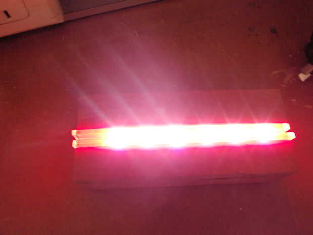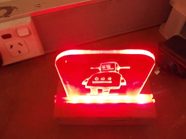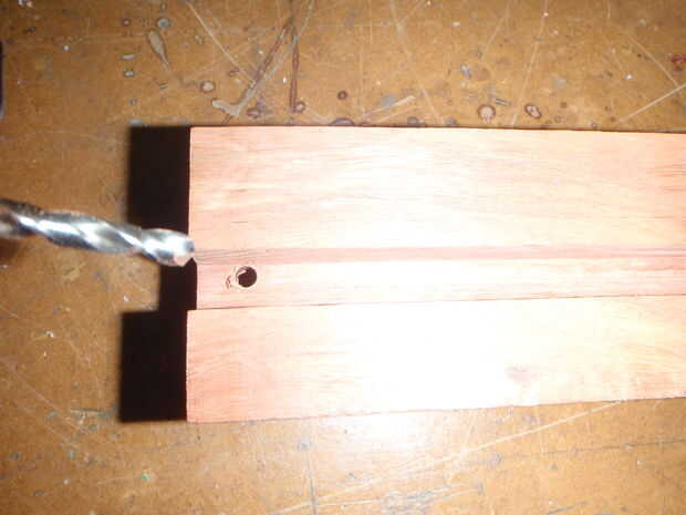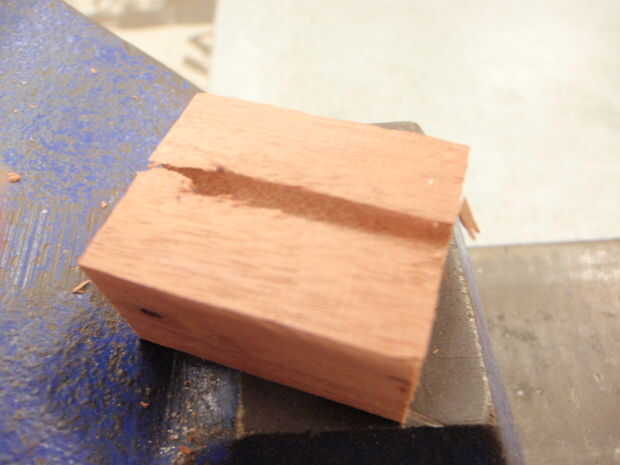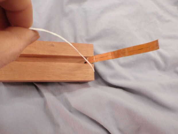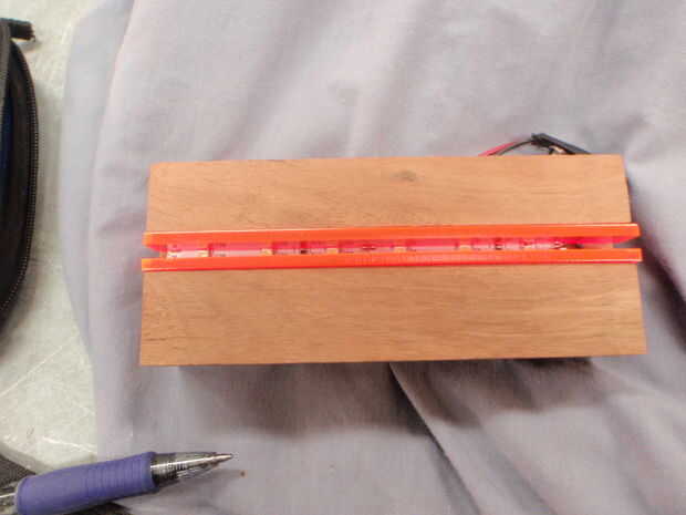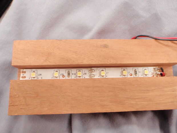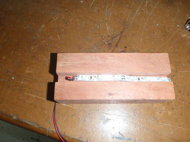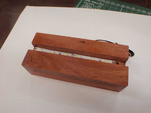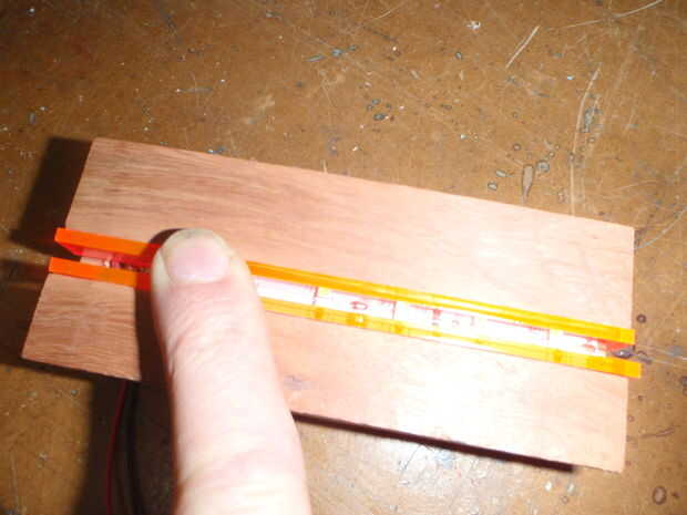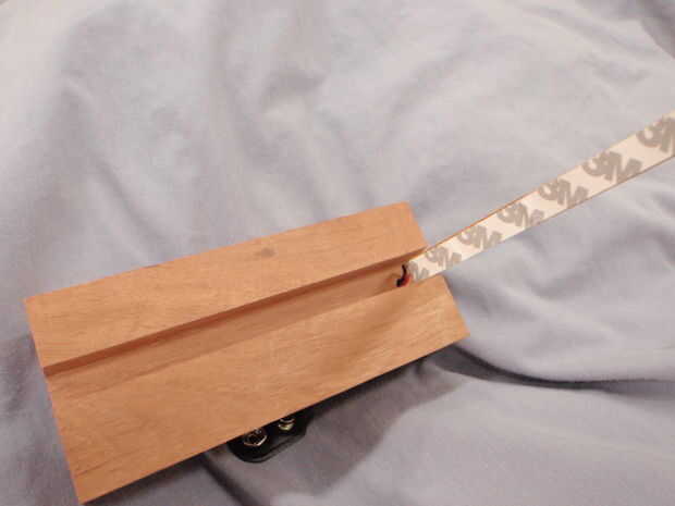La ranura se cortó en una sierra de banco y residuos recorte con un formón. Se cortó una ranura de 9mm 10mm de profundidad en la parte superior como la cinta de 9mm de ancho. 2 piezas de acrílico grueso de 3mm se cortaron como espacios para localizar y apoyar el signo, y estas se colocan encima de la cinta.