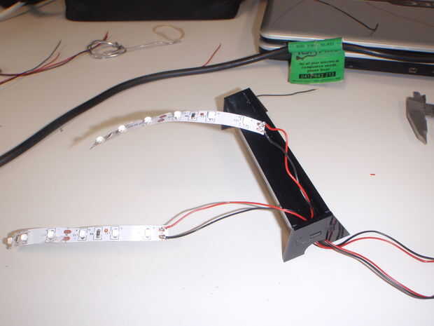 Una vez que la base se pega las cintas pueden tener alambres soldados a ellos, el forro adhesivo retira y coloca en la base. Existe cierta superposición en el medio, ya que las cintas de 9 mm de ancho el espacio es solamente 15mm.