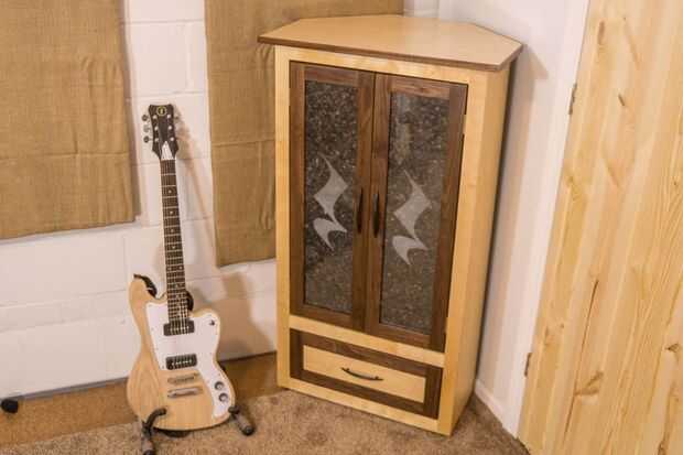 este es un gabinete de estilo Arts & Crafts de madera maciza.El tamaño total de este proyecto es de 48" de ancho, 38 ½" de alto y 13" de profundidad. Tiene 5 cajones y 2 puertas.La madera principal es cereza. Los paneles de puerta son A