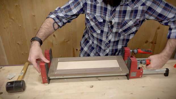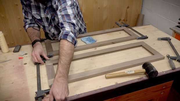 A continuación puede pegar los cajones y las puertas. Para el cajón necesita cortar una hoja de 1/4" de madera contrachapada para adaptarse. Puede dejar los paneles de puerta vacía por ahora.