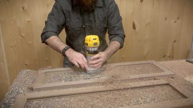 Con un poco de rebajos montado en su router puede luego pase un rebajo en la parte trasera de los paneles de puerta para aceptar el vidrio.