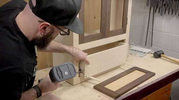 Con las diapositivas del cajón atadas gabinete ahora puede colocar las diapositivas al cajón. Coloque un par de calzas por debajo del cajón sólo por lo que no frote a lo largo de la parte inferior y atornille en su lugar.