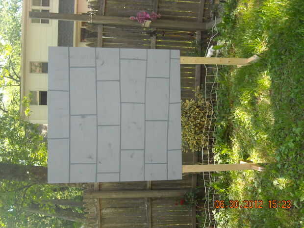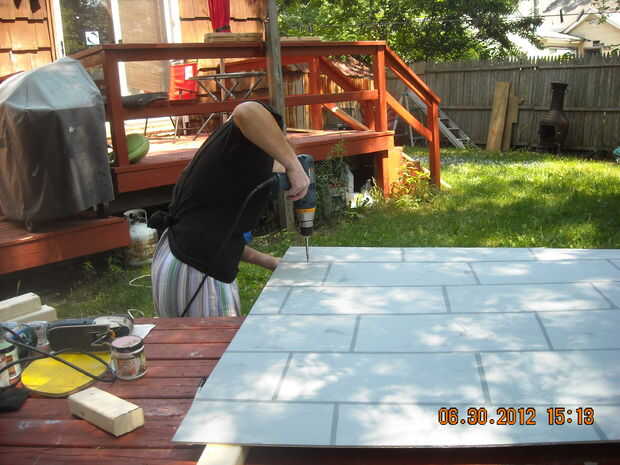 Una vez que los agujeros se pretaladran, línea de la viga del soporte en forma de T y atornille el tablero de fondo en las vigas. Hacer esto para ambos lados para que puedas tener un fondo de pié.