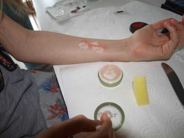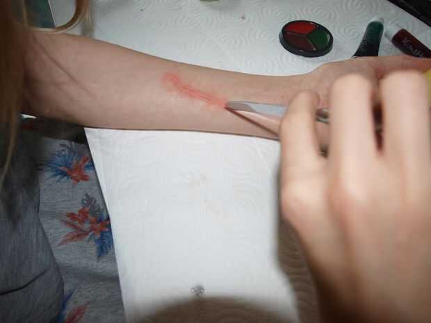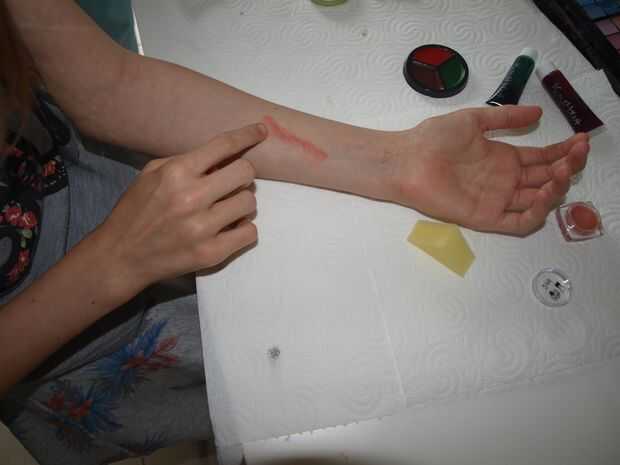 Tomar una cucharada pequeña de la masilla y ponerlo en el lugar donde usted lo desee. Entonces forma y escultura por lo que parece una cicatriz a usted. Lo que hice fue hacer una salchicha (longitud de la cicatriz) de la masilla y lo puso en mi brazo. Entonces tipo de raspa los lados a mi piel para que se peguen. Después de eso, tomé un cuchillo (no agudo de lado) y tipo de corte a través de la salchicha. Para añadir un efecto de piel puse algún papel de tejido fino en los 2 lados al lado de la salchicha.