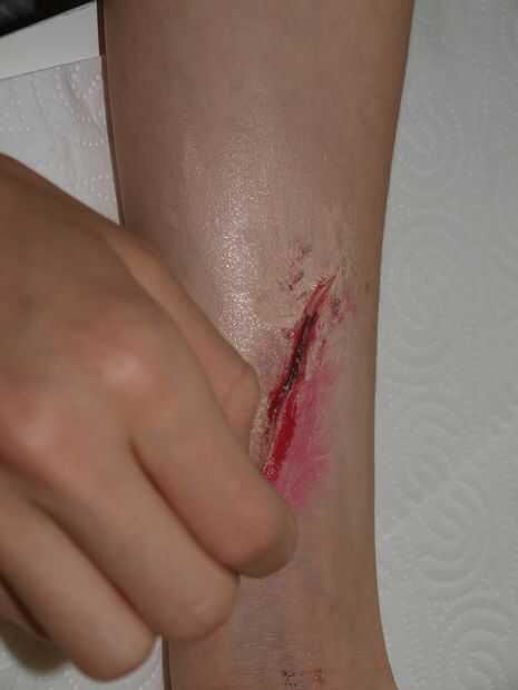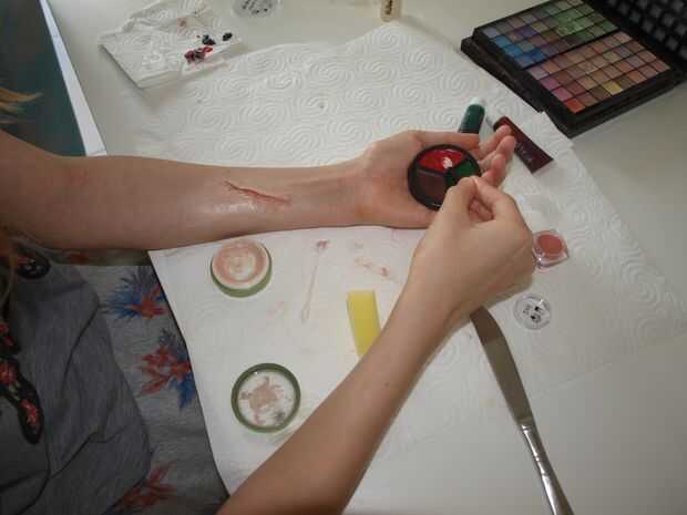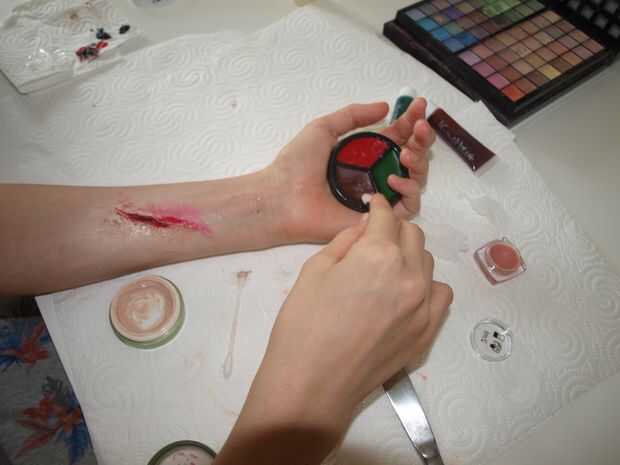 Para el siguiente paso vamos a utilizar la pintura de cuerpo. Ahora podemos utilizar un cepillo (yo usé un q-TIP), pero muy delgada. Utilizamos un color rojo brillante y el color en el rin que hicimos con el cuchillo de la masilla. Luego si quieres que también un poco puede colorear los bordes superiores del rin con un rojo más oscuro (marrón). Esto le dará un aspecto más tridimensional a su cicatriz.