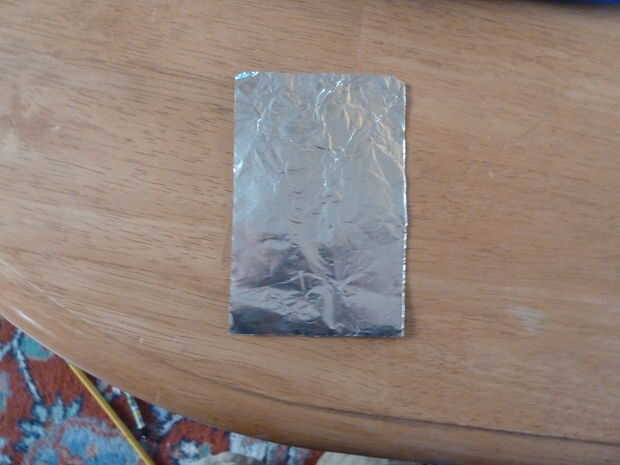 Cortar un trozo de cartulina que es alrededor tan grande como uno de los pedazos de goma de esas delgadas, Wrigley. Luego cortar un trozo de papel de aluminio sobre 3 x el whith y 1 1/2 x la altura de la pieza de cartulina. ASEGÚRESE DE QUE LA CARTULINA Y PAPEL DE ALUMINIO SON AMBOS CORTE RECTO! Su "goma" se verá mucho más creíble de esta manera.
