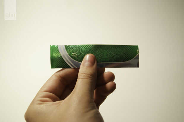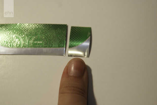Decidir qué parte de la can desea te clavo o los clavos. Creo que es más fácil cortar una tira suficientemente amplia como para ser la longitud de la uña final y luego cortarlo a trocitos ajuste el ancho de mi uña (si encuentras esto confuso, mira las fotos).