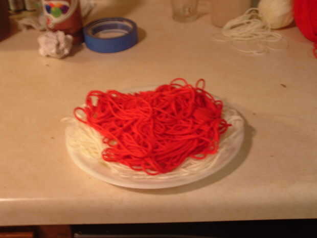 fondo rojo hilado para obtener una consistencia espesa. Esta vez, usted quiere lo suficiente, para que todavía se pueden ver alrededor de una pulgada de salida sobresaliendo espaguetis debajo de la salsa de tomate. Revuelva cuidadosamente con su pasta para dar una sensación agradable, hogareña. Al igual que mi querida madre hace.