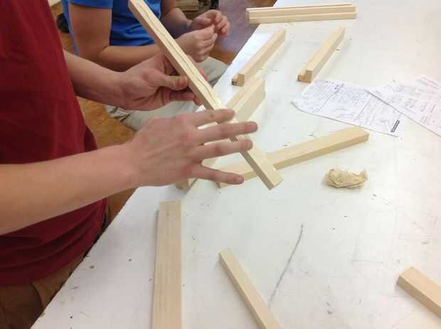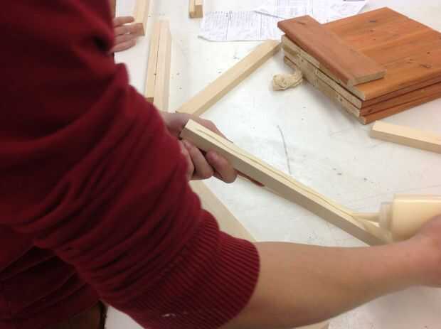 - Al pegar los dos trozos juntos para las esquinas, los ponen en la mesa para que las superficies se alinean.