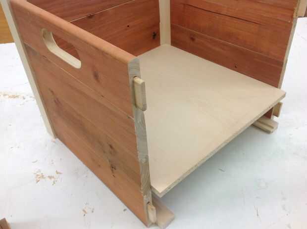 Se trata de un simple cajón de madera, hecho de una sola sobra cerca madera de pino y un pedazo de madera desechado. Se une por una combinación de pegamento para madera, clavos y una rudimentaria lengüeta y ranura.Es sorprendentemente ligero (siendo