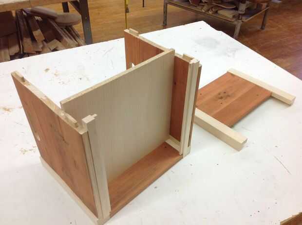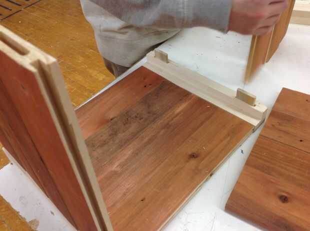 8. Los lados y parte posterior del cajón se cortan de piezas de desecho de material. No ofrezco estas medidas porque en esta etapa del proyecto pueden variar de alumno a alumno. Si ellos han hecho esto mucho, ese cajón es la parte fácil.