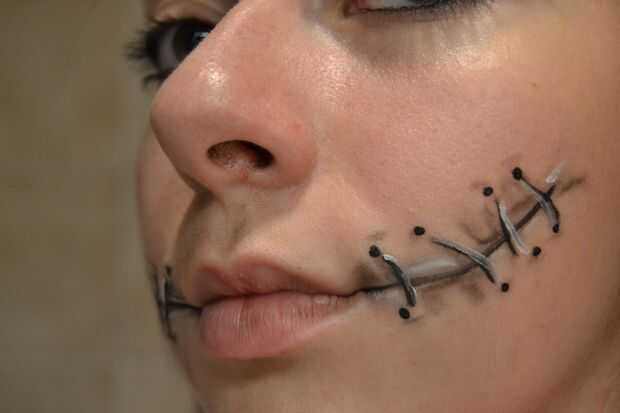 todos los productos utilizados fueron comprados en Wal-Mart durante Halloween!Paso 1: utilizando un delineador de ojos blanco para esbozar su idea de la boca.Entonces utilice el color bronceado verdoso de la pila"zombie maquillaje" todo el rostr