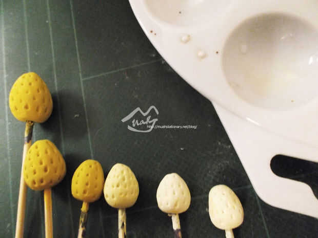Cuando el rojo es seco, pendiente el resto de la fresa de rojo a amarillo con una esponja.