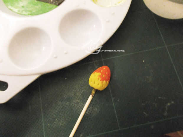 Cuando esté seca la pintura amarilla, pinta la punta de la fresa roja con un pincel.