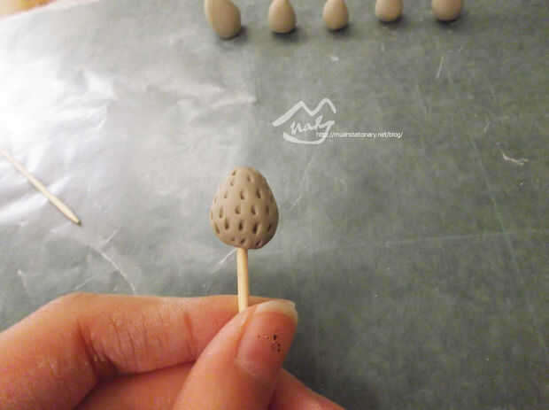 Palillo Mondadientes en el extremo plano (donde las hojas son generalmente) de las fresas
