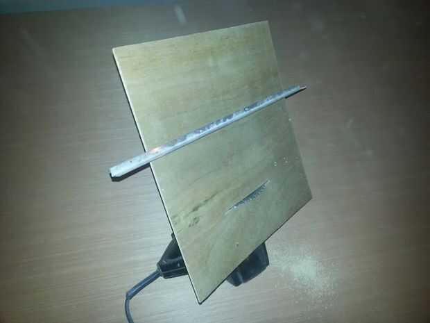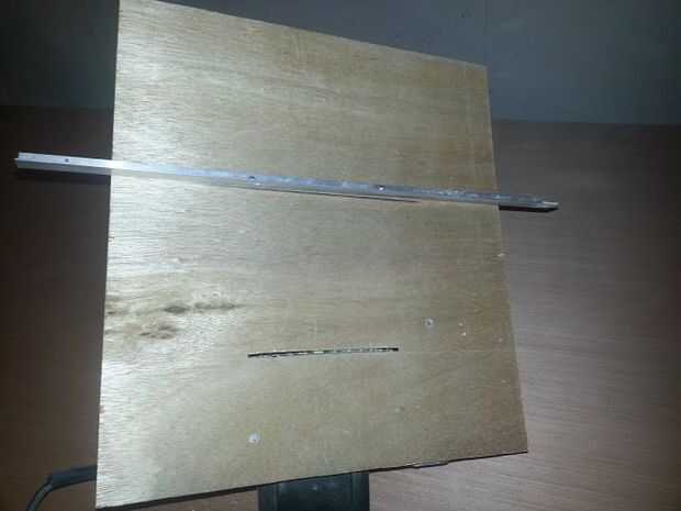 3) una vez que la sierra está completamente asegurada a la luan, cuelgue del borde de su banco de trabajo de la sierra, enchufe en y bajar a través de la hoja de luan.