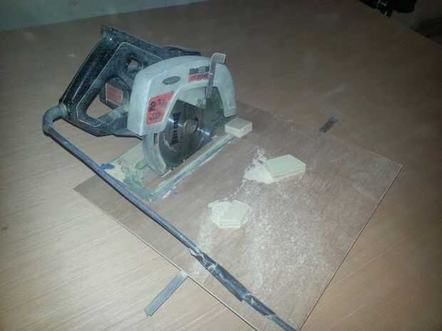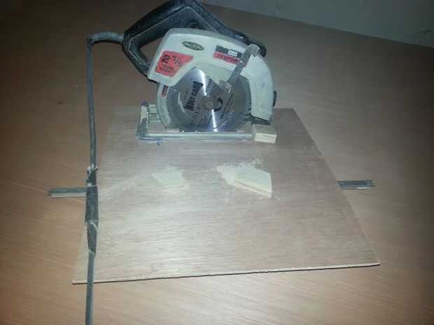 1) tome un pedazo de luan que es ligeramente más larga que la base de la sierra circular y más ancha que la anchura de las juntas que van a cortar.