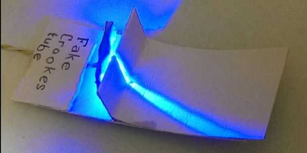 a diferencia de los electrones, fotones pueden propagarse en el aire, pero, por supuesto, usted no puede desviarlos con el imán, como sería desviar los electrones en un tubo de Crookes real. Pero usted puede simular la desviación moviendo ligeramente el LED.