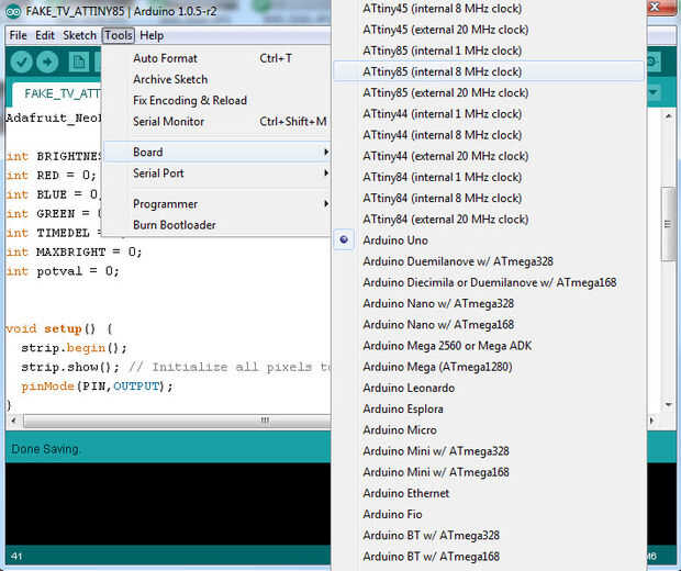 Gran cosa aquí es asegurarse de cargar el gestor de arranque después de seleccionar el reloj interno de 8 MHz. Si quema los fusibles no funcionará mal. Después de cargar el gestor de arranque entonces subir el código que suministran y luego el ATTiny está programado y listo para su dispositivo de TV falsos!