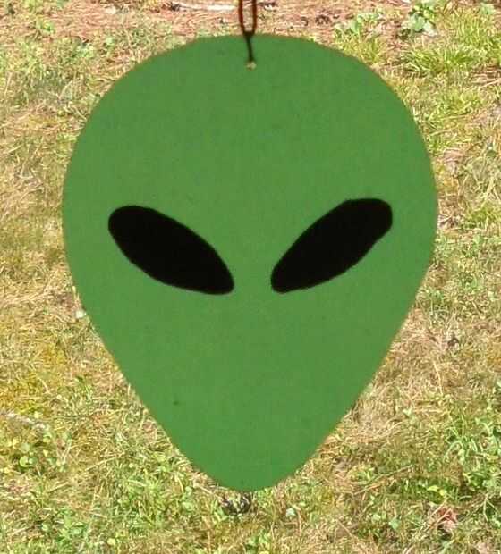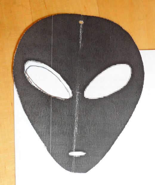 Para el extranjero, recorta los ojos del patrón y usar una plantilla para un patrones de ojo. Utilizando los patrones de ojo, cortar ojos de cinta aislante negra y añadir a alien. Coloque el patrón tras el cristal para ayudar con la colocación del ojo.