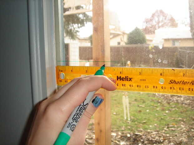 Para este siguiente paso recuerda que la perfección no es necesaria. Necesita para lucir bonita pero nunca se preocupa acerca de medidas exactas. Transferencia de las líneas del boceto a la ventana usando una regla (o con otro borde estrecho) y su sharpi. O mano patrón de transferencia. Mi primer patrón de ventana se hizo a mano libre. Este patrón resulta necesario un borde estrecho.
