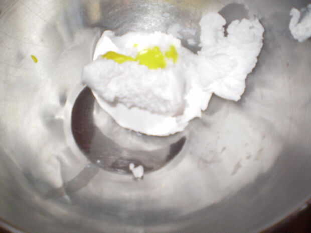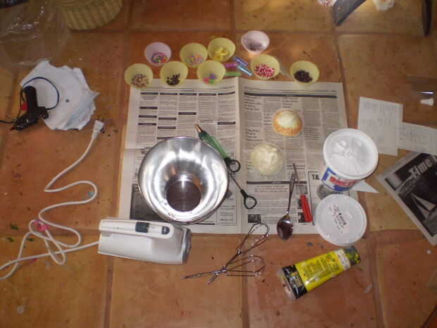 Proteger su área: colocar periódicos! (este paso también es desordenado) Usted será probablemente también ropa quiere ponerse viejo, aunque los guantes no son necesarios en este paso. Obtener todo sus materiales establecidos antes de empezar porque tienes que mover rápidamente: tazón, cuchara, spackle (y quizá un destornillador para conseguir abrir con), pastelera (aquí estoy utilizando una pasta plástica nifty cosita, que rompió a la mitad y regresé a la bolsa), pinturas acrílicas y la punta de la pastelería, junto con sus tortas y coberturas y cosas de alambre. Para hacer el glaseado, poner una cucharada de spackle ligero en su recipiente y añadir un poco de pintura acrílica para tinte (a menos que quieras llano blanco glaseado...) Para hacer una deliciosa crema de mantequilla, añadir un poco de amarillo. Luego, mezcla para arriba con su eggbeater hasta que todo está bien combinado y se parece a helar. a continuación, cuchara alguno en su pastelería bolsa con punta conectado y empezar a exprimir hacia fuera en sus magdalenas... probablemente tienes que experimentar un poco primero. Esta mezcla se comporta mucho como helar excepto es frothier así que es bastante fácil de trabajar. Después de colocarle el glaseado, añada su cobertura de elección y meter el gancho de metal o el titular de la tarjeta en la parte superior (no preocuparse-el compuesto de juntas es bastante duro cuando se seca!)
