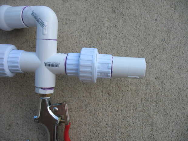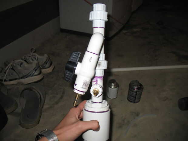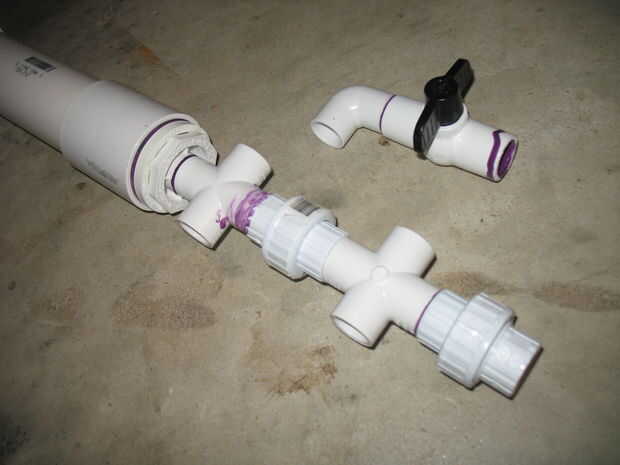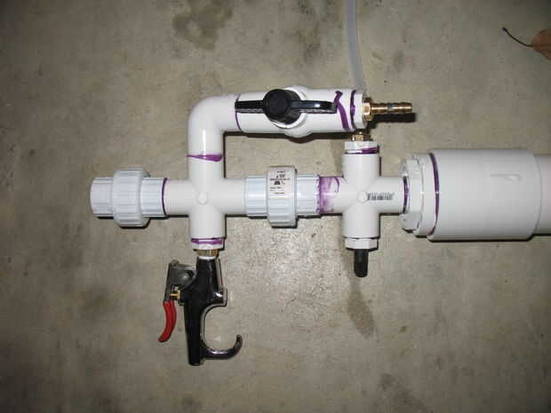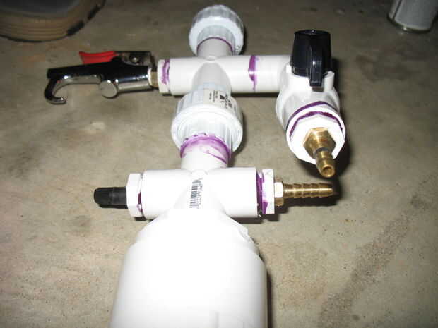 Conecte los 2" piezas para hacer una cámara. De la espalda, coloque una intersección toma de Unión, intersección y Unión zócalo. Coloque la válvula de bola y el codo como unidad independiente. Desarmar la toma detrás Unión puede facilitar el montaje. Coloque el tapón de válvula de llenado en la intersección inferior posterior, con un enchufe de lengüeta de la manguera en el lado opuesto. Fije el ensamble del gatillo enchufe en la intersección de la parte inferior delantera. El otro enchufe de la lengüeta de la manguera se conecta al extremo libre de la válvula de bola. Sujete la unidad de válvula de bola a la esquina delantera superior.