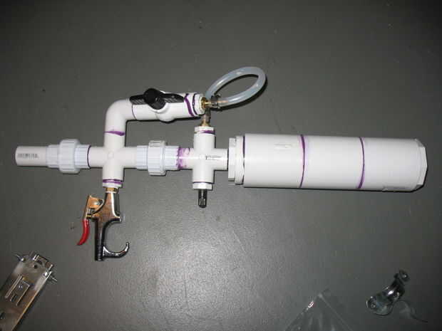 Después de acabado este arma, tenencia y la leña en un par de veces, realmente hizo no como cuánto aire tanque era y cómo su longitud lo hace difícil de manejar. He hackeado a 4 pulgadas de tubo desde el centro de la cámara y caben en un acoplador de 2". A pesar de que la cámara tiene una capacidad menor, el hecho de que la cámara entera prácticamente se duplica en el espesor de la pared añade una sensación de seguridad al manejarla. El nuevo volumen de la cámara se corresponde con una 28 "x 1/2" del barril, por lo que es lo que uso ahora.