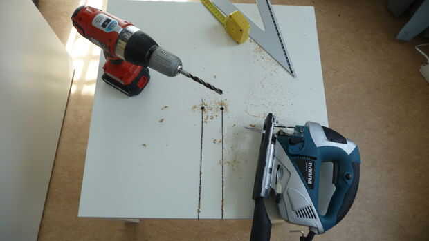 • Empiece a cortar con la sierra caladora siguiendo las líneas. Perfore unos agujeros en las esquinas para evitar romper la sierra.