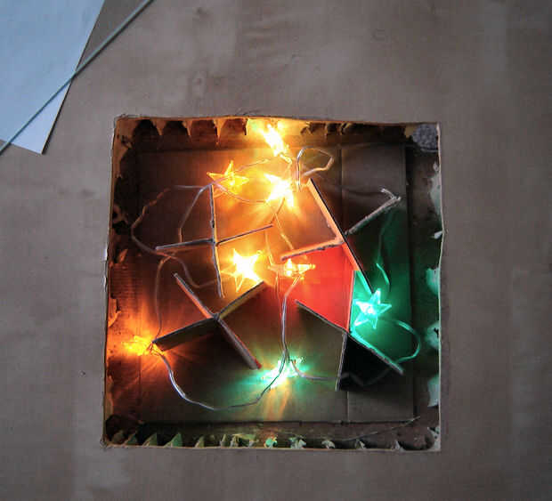 Agregar una cadena de luces de Navidad para alegrar tu mesa.  Colocar las luces en la tabla y ejecute el tapón a través del orificio en la parte inferior.  Añadir el cartón soporta y coloque un pedazo de vidrio esmerilado sobre la parte superior o puede utilizar el libro blanco y cristal en el paso 8.