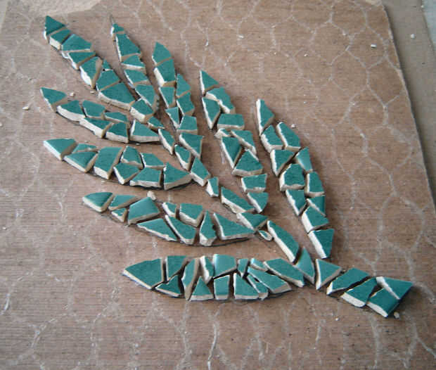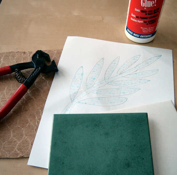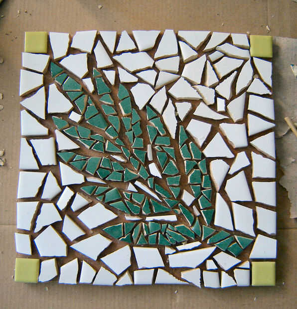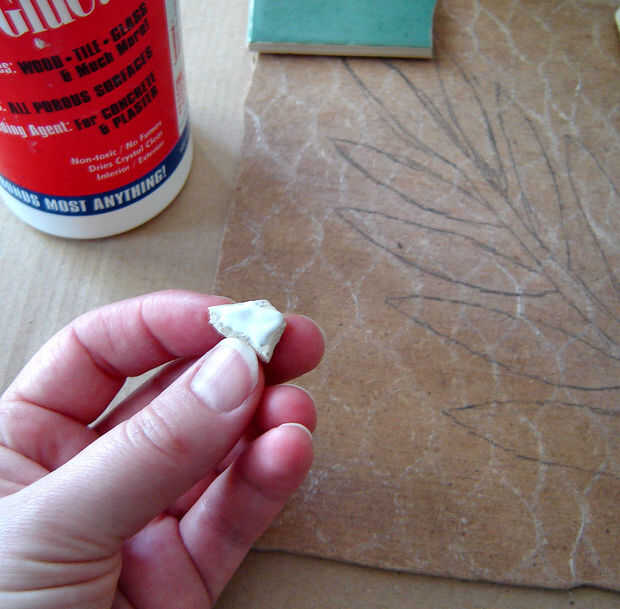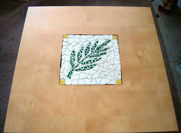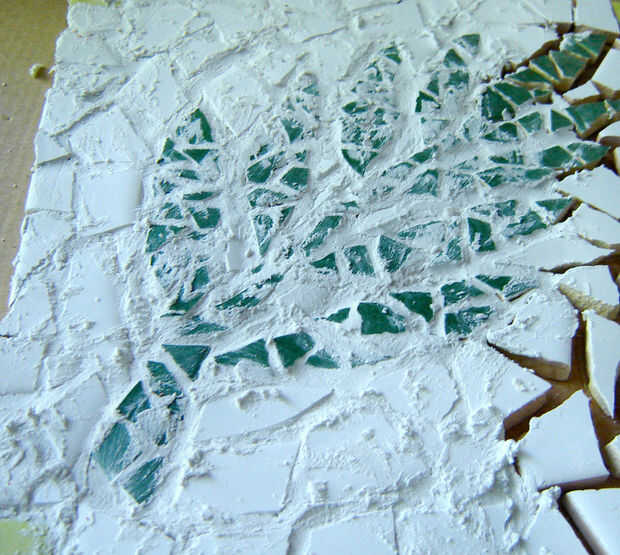 Comenzar con el patrón que desee y transferencia a la pieza de la tapa de tabla que ha cortado. Empezar a romper las piezas de azulejo y péguelo a la Junta según el patrón. Cuando las piezas se pegan en cubrirlo en lechada. Limpie el exceso del rejunte de la superficie. Una vez que la lechada se haya secado puede poner los soportes de cartón en el agujero y colocar el mosaico encima.