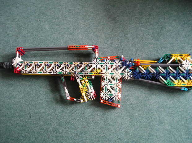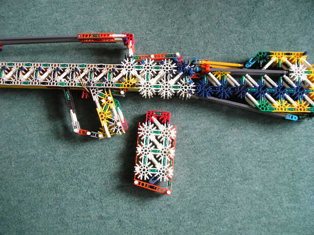 paciencia conmigo ya que este es mi primer ible. Este es mi rifle de asalto famas KVG. En palabras de knexfreek odio celebrar!!!!!! Podría publicar instrucciones si suficientes personas quierenPros-realista-tiene un clip de-gran variedad-es un arma b