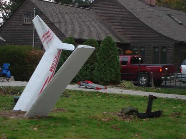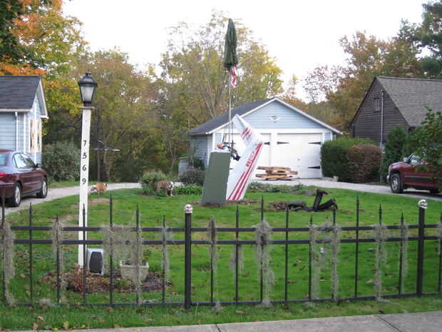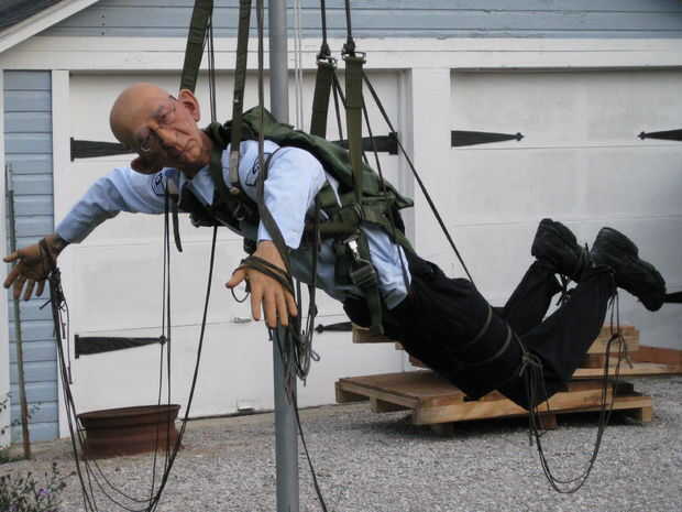 Para divertirse con el barrio y jugar sobre un tema de lado, construí un desplome de plano en mi patio. El patio lateral no tiene nada en el año pasado este año, tuve una pizarra en blanco. El plano incluye un piloto y copiloto así. El copiloto olvidó tire de su cable de conducto y el piloto tiró su pero tiene colgado en el asta de la bandera. Compré parachutes real y arneses desde un centro de pruebas que se les considera peligrosos para el vuelo, creado algunos mecanismos de piernas coleando con la ayuda de la web ScaryTerry como guía suelto, y ponerlos a la activación de movimiento utilizando un centro neurálgico de tripas de monstruo.