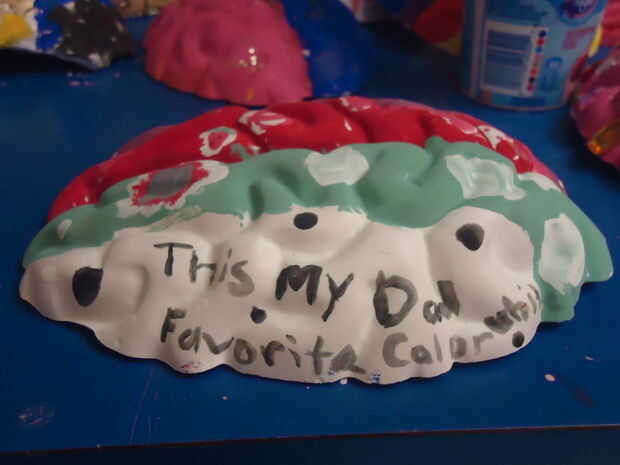 Un voluntario me ayudó a mezclar el yeso y el agua y luego vierte en un molde de cerebro. Al día siguiente, una vez que se seca la pinté en la sala de arte. Pinté todas las piezas con un color diferente para un miembro de mi familia. Usé todos sus colores favoritos para representar a la gente de mi familia. Color favorito de mi papá es blanco, mi mamá es verde, mi hermana es de color rosa y mi color favorito es el morado.