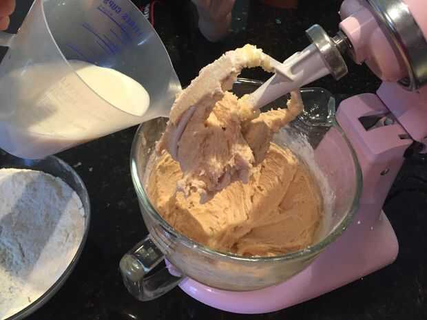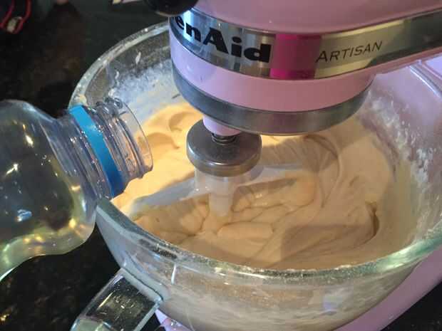 Añadir el polvo de hornear a la harina y batir juntos para deshacerse de algún tumor y luego añadir 1/3 de la mezcla de harina a la mezcla de mantequilla y batir juntos. Luego agregar 1/3 de la leche y continuar a batir la mezcla. repetir agregando 1/3 de la mezcla de harina y leche alternativamente hasta que todos incorporados. Por último añadir las 4 cucharadas de aceite a la mezcla y revuelva hasta combinar.