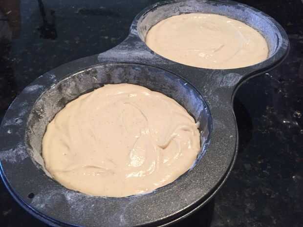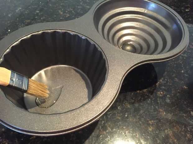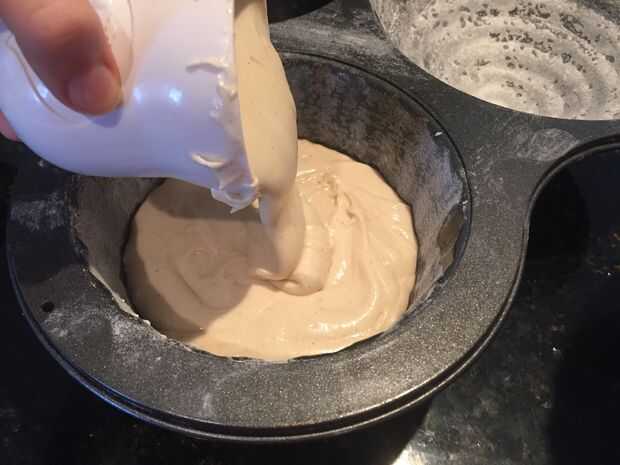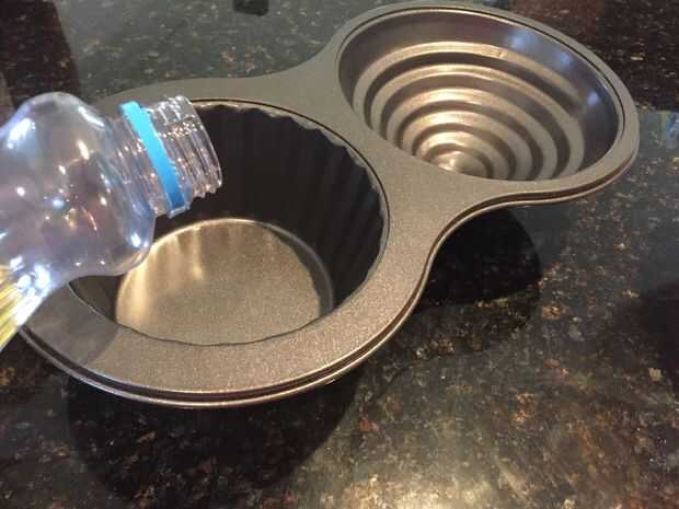 En la base de la Magdalena gigante coloca 3 1/2 tazas de la mezcla de pastel y alíselo. Luego la parte superior de la Magdalena (forma de pirámide swirly) colocar 2 1/2 tazas de masa de tarta y alisar la masa en la parte superior.