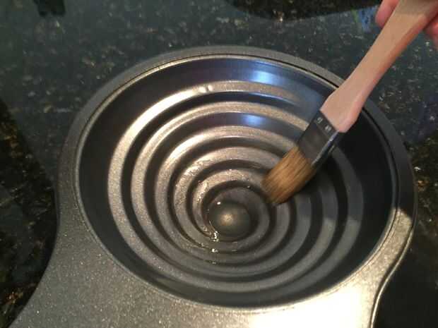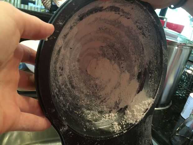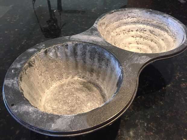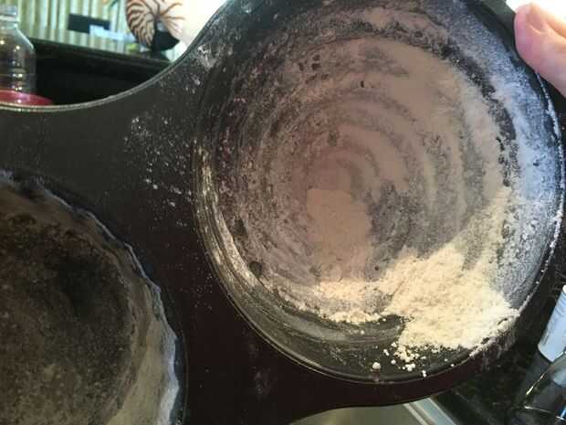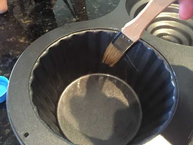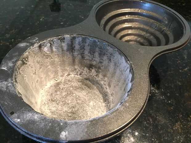 El pastel gigante lata si no es capa libre de palo la lata con mantequilla o aceite por todos lados luego espolvorear con harina hasta que está completamente recubierto.