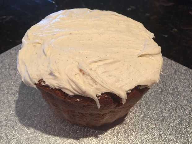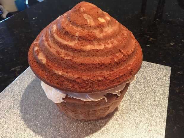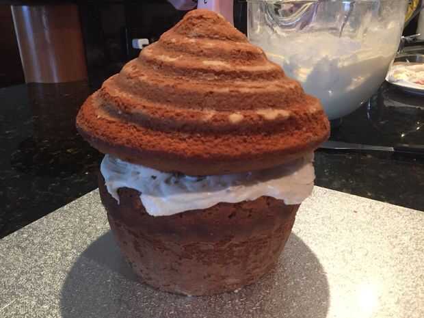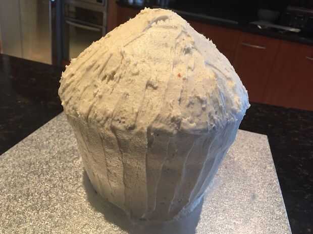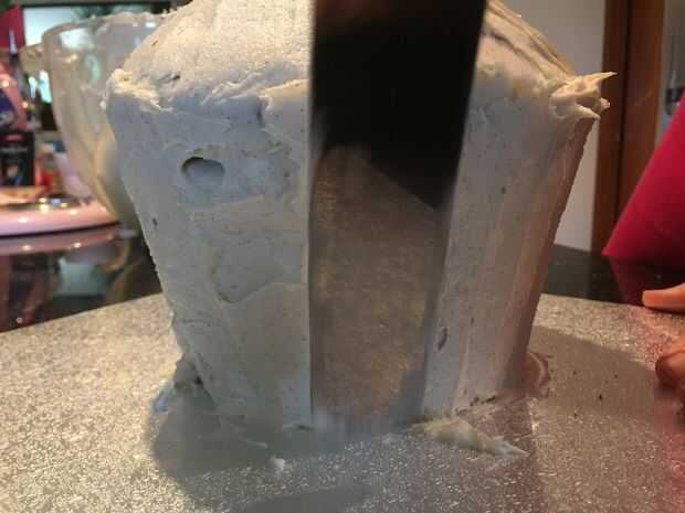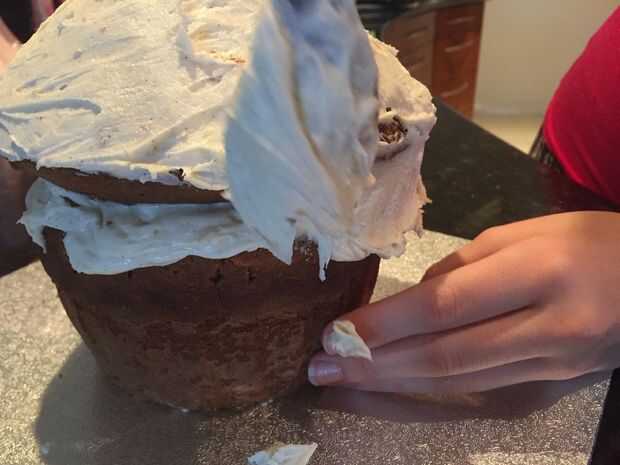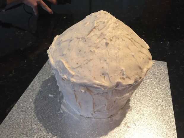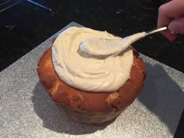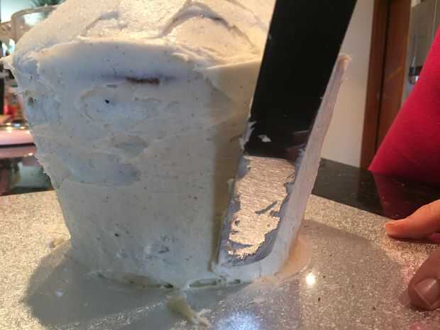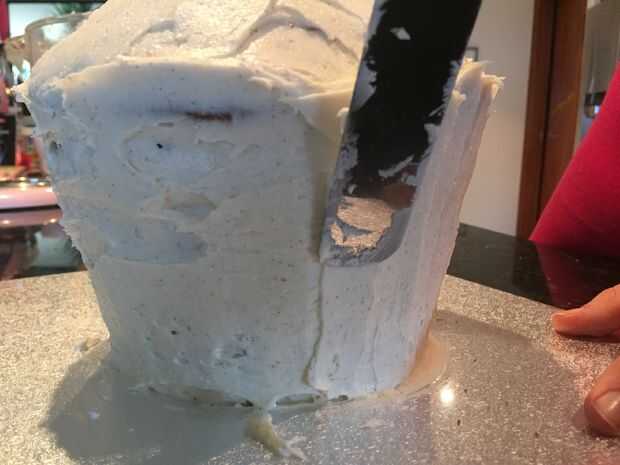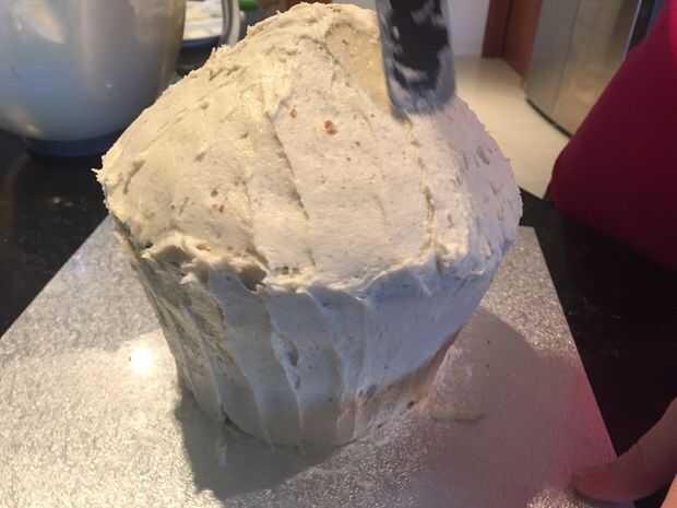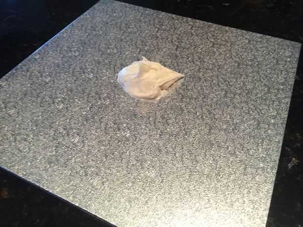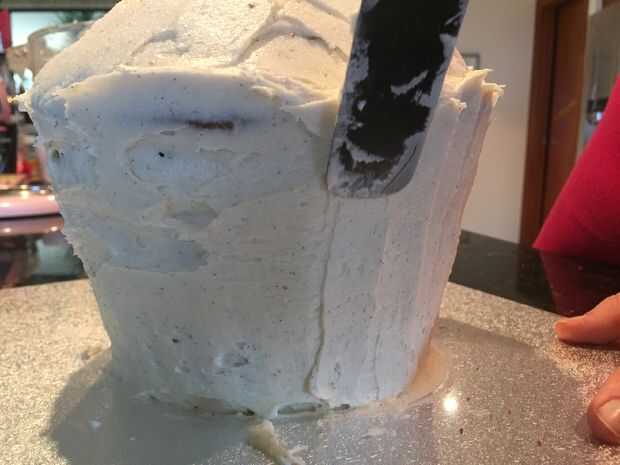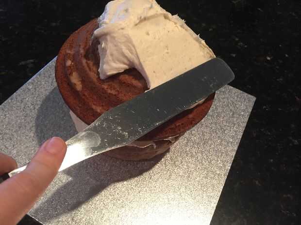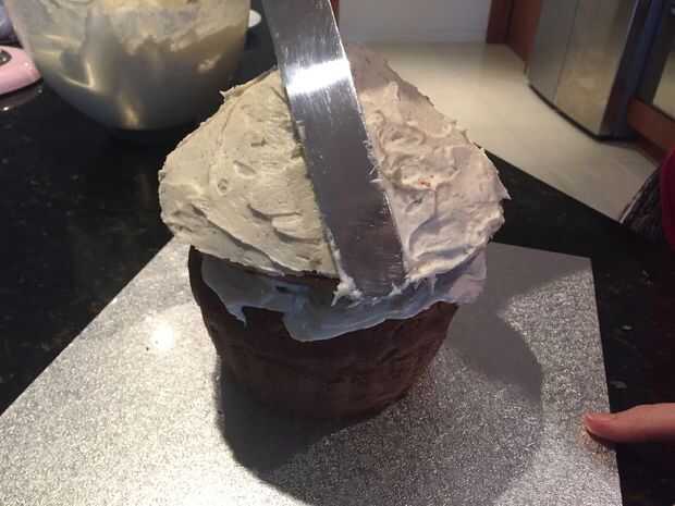 Cuando el pastel está completamente enfriado y el glaseado de crema de mantequilla se lleva a cabo aproximadamente una cucharada de hielo en un plato y lugar la 'base' en la parte superior de la Magdalena. Luego poner aproximadamente 1-2 cucharadas encima de la base y el lugar del 'top' de la Magdalena. Con una capa piense de mantequilla helar crema y la espátula (o cuchillo mantequilla filo plano) vaya alrededor de la torta, creando una capa de miga de helar. Esto es apenas una capa que cubre la torta para coger las migajas para que no se presentan en su capa de glaseado final. Luego por la miga capa pone otra capa de glaseado blanco.