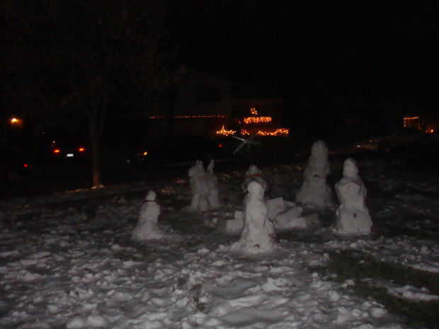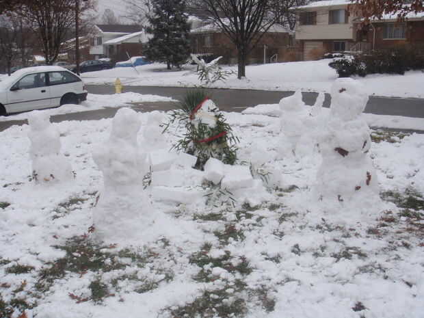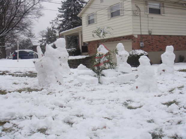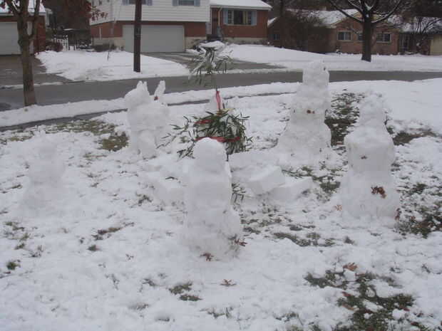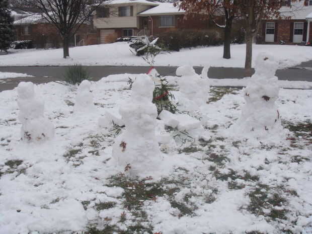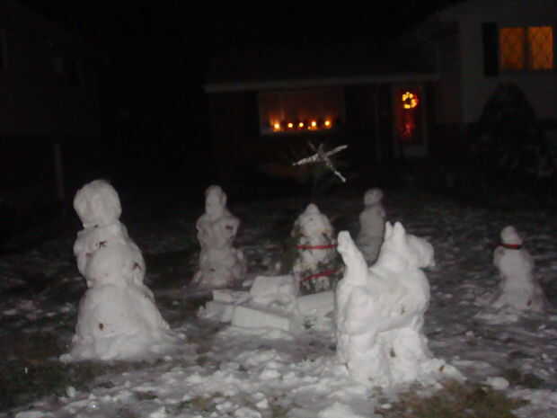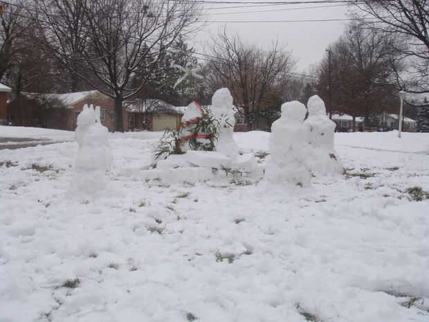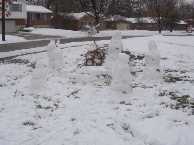 no estoy seguro si estas imágenes son bastante claras (incluso con varios ángulos y en diferentes momentos del día) pero lo que se supone que esto es una representación de nuestra familia. Mamá, papá, 2 niños, nuestro perro y un árbol de Navidad en el centro con ramas de hojas verdes, una estrella en la parte superior y la nieve se presenta alrededor de la base del árbol.