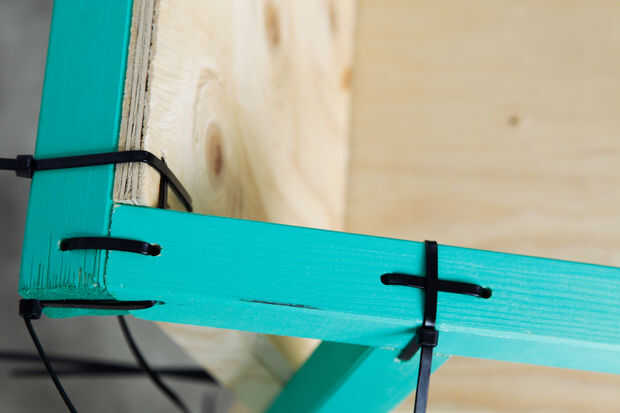Una vez cortado, pulido y perforado, las piezas de madera son sencillamente con una sujeción de cable.