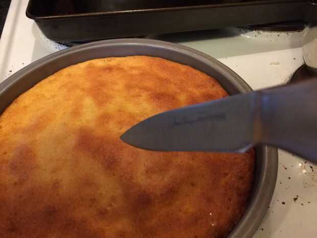 ¿Al llegar la torta hacia fuera, haga la prueba de cuchillo: un cuchillo sale limpio cuando apuñalado en el centro? Si es así, se hace la torta.
