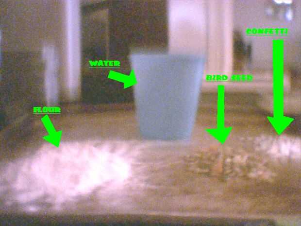 Lo que usted necesita. Ventilador de techo eléctrico. Silla o escalón de la escalera. Ya sea de arroz o confeti o tazas pequeñas de agua o harina o alpiste.