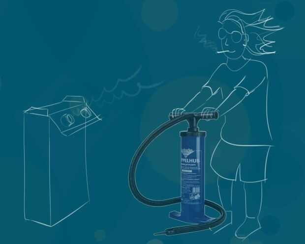 La bomba del ventilador es un producto sostenible donde la tecnología cumple con las necesidades de clientes en situaciones difíciles. Introduje un método sencillo de mantener fresca la cabeza cuando soplan su barco o colchón de aire en un festival, donde es muy caliente y sudoroso. Los dos ventiladores soplan aire fresco cuando son alimentados por un panel solar. Yo lo inventé para una asignación de la escuela de diseño de producto (en el centro de Diseño Industrial de Howest) para la creatividad.