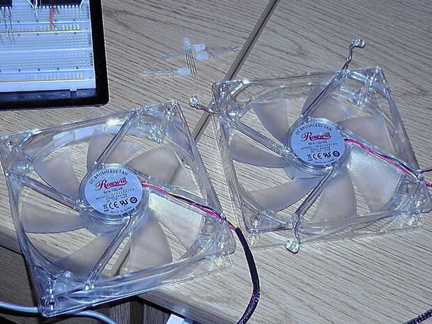 Para preparar los RGB LED, celebrada en ayudar a las manos, doblar los cables cerca de la base y soldar un cable de cinta de 4 pines. Los LED fueron luego encajan en los orificios del ventilador y utiliza cinta transparente para sujetar los cables de cinta al cuerpo del ventilador, luego había liado junto con la cinta más que cable de alimentación del ventilador sale para que todos los cables pueden ser agrupados.