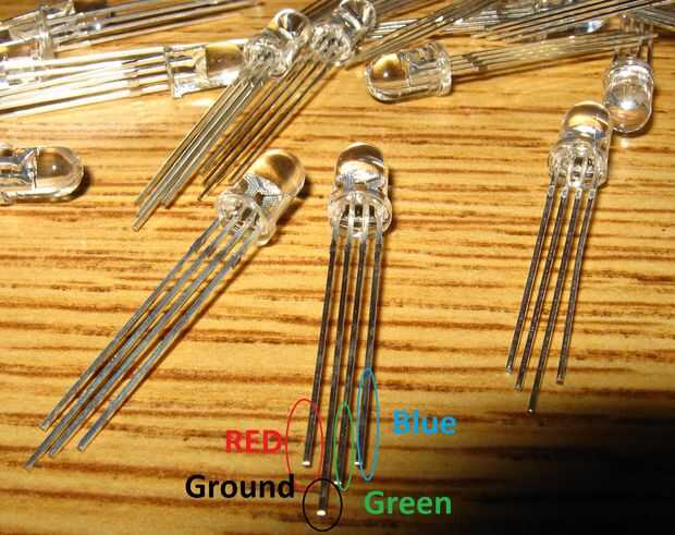 Nota cual cable es tierra al soldar a los LED RGB. Si sabe que uno puede encontrar el resto de la tierra, el pinout es rojo tierra verde azul. También, si el agua clara de LED, es una buena idea de lijar con lija fina hasta que tengan una mirada helada, difusa. El LED claro no mezcla colores bien a menos que se difunden mediante lijado o por otros medios.