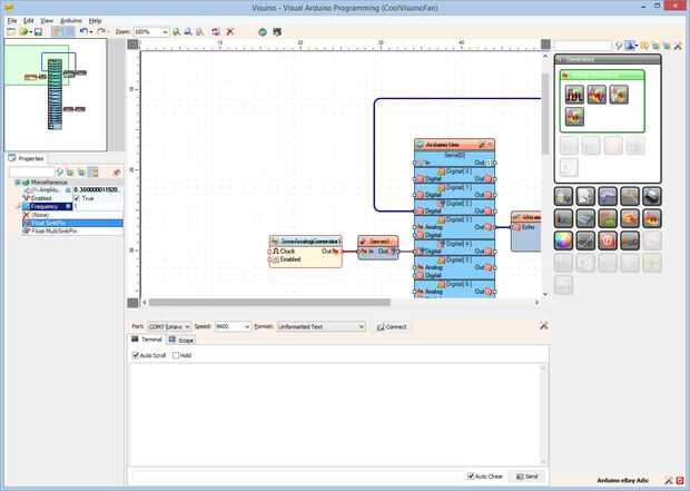 Para activar o desactivar el generador sinusoidal y control de su frecuencia, necesitamos añadir pins a algunas de las propiedades: