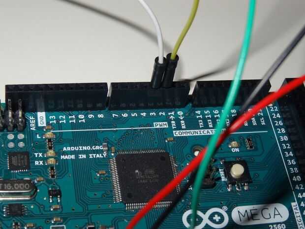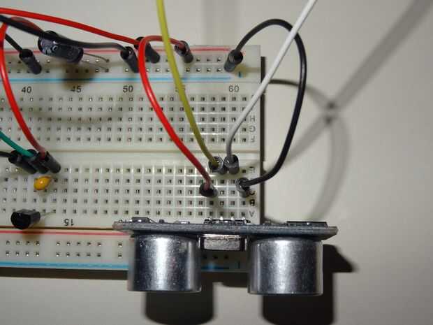 2. Conectarse la alimentación(cable rojo) tierra(cable negro), gatillo(cable amarillo) y Ping/Echo(cable blanco) el Ranger ultrasónico. Conecte el otro extremo de los cables de alimentación y tierra para la alimentación y tierra del autobús de la energía de la placa (foto 1)